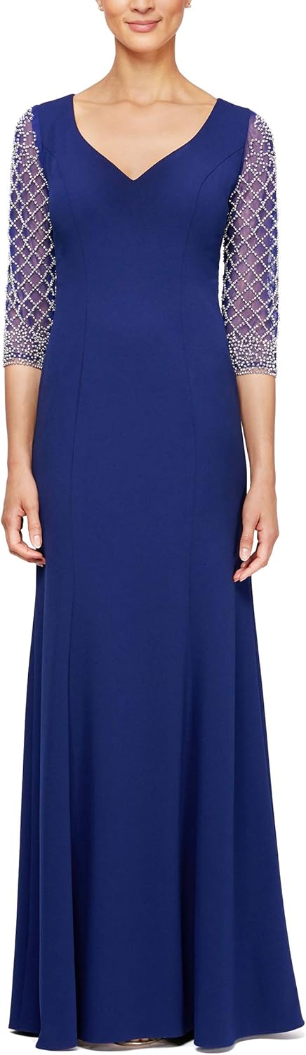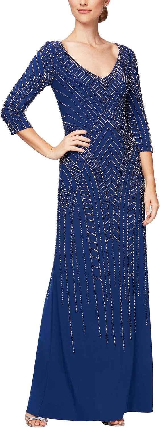 Alex Evenings Women’s Long Beaded Fit and Flare Dress with 3\/4 Sleeve