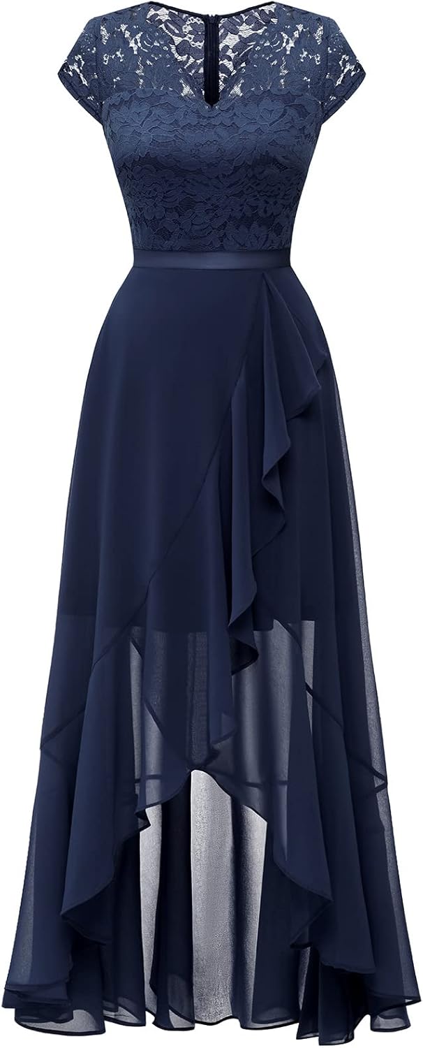 Lace chiffon dress specially designed with hi-lo ruffle skirt, suitable as a formal dress. Comfy and flattering silhouette, ideal as a wedding guest dress and prom party dress. Elegant and classic style, great for wedding prom party, a nice bridesmaid dress or bridal shower dress.