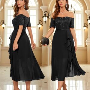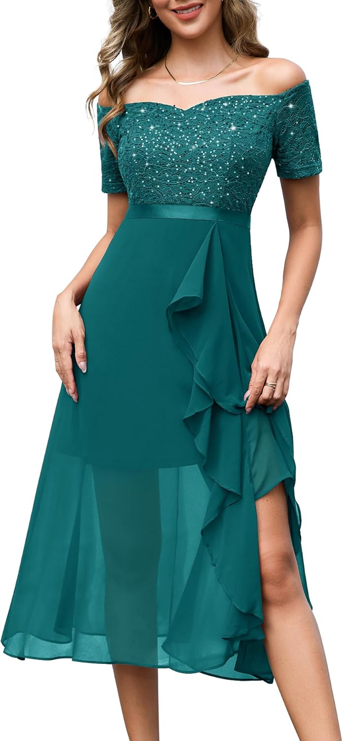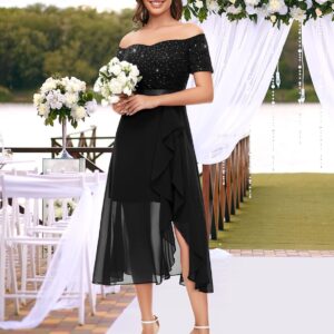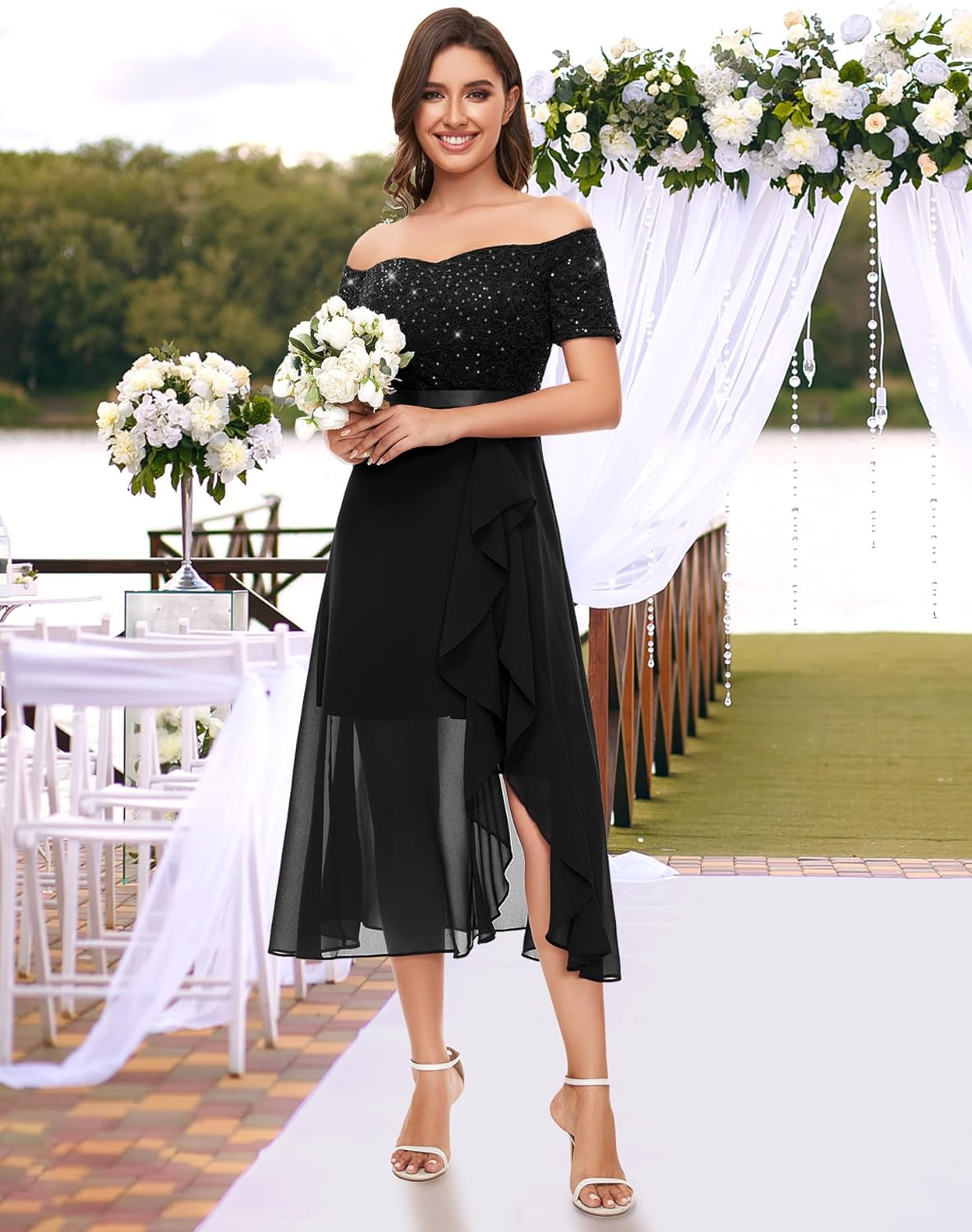 BeryLove Sequin Wedding Guest Bridesmaid Off Shoulder Long Ruffle Dress