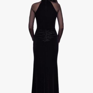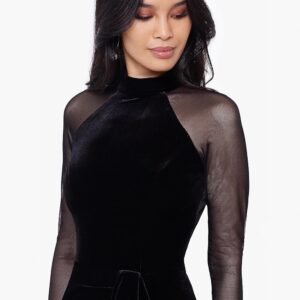 Betsy & Adam Women’s Long Velvet Illusion Sleeve Mock Neck Ruched Gown