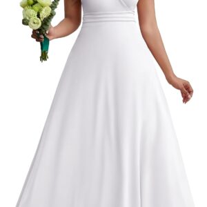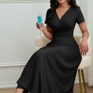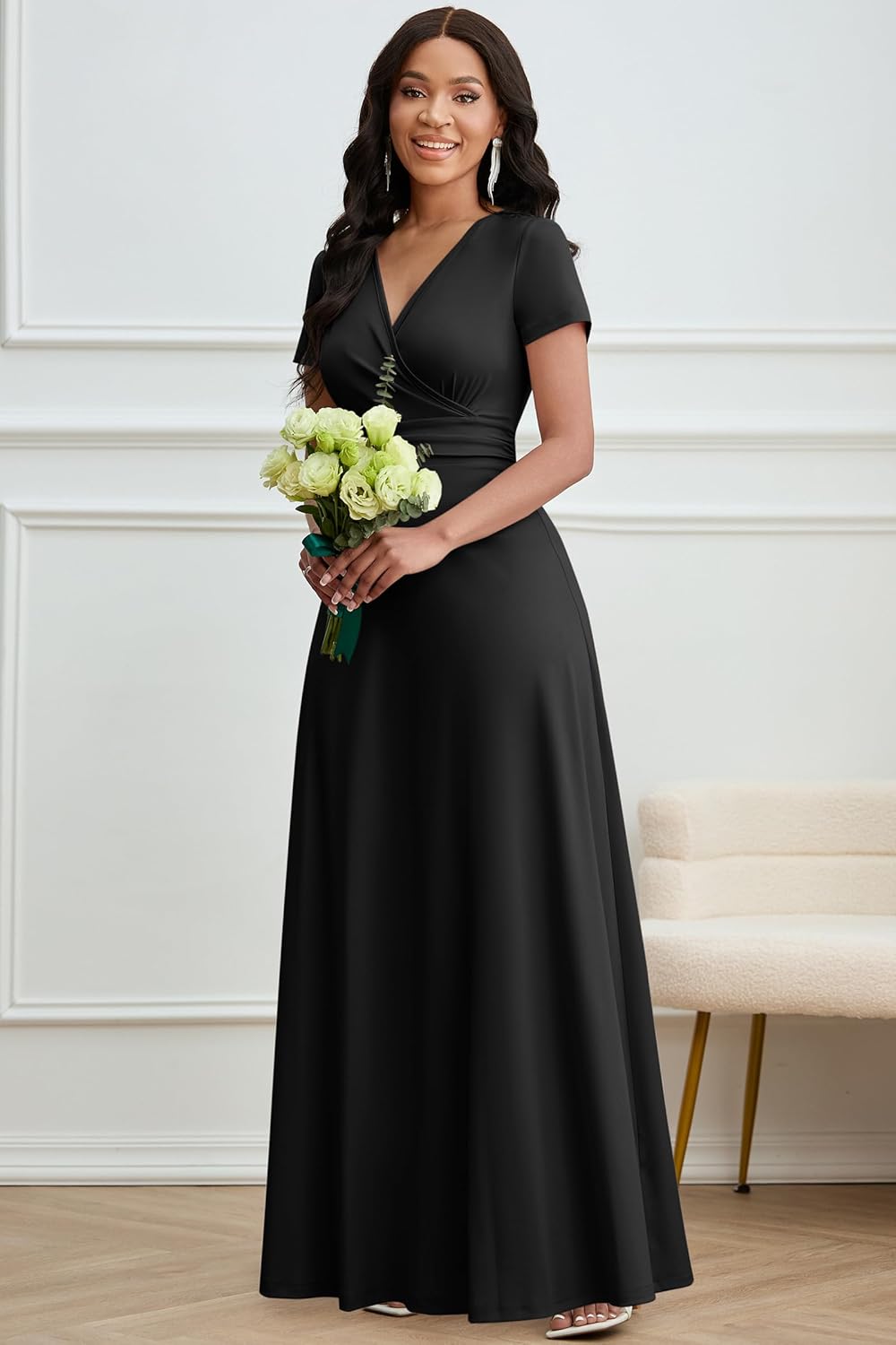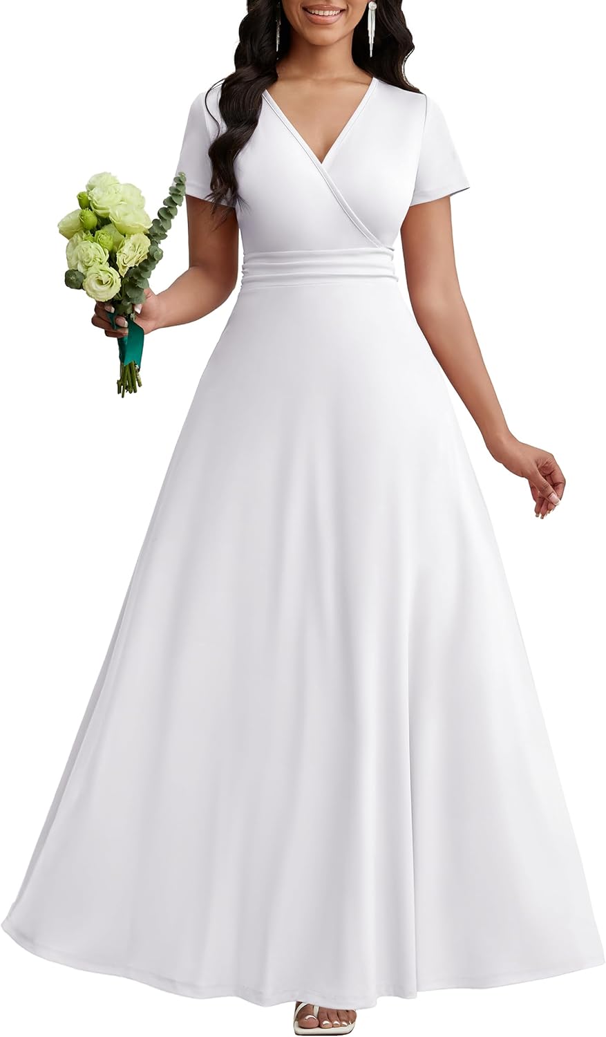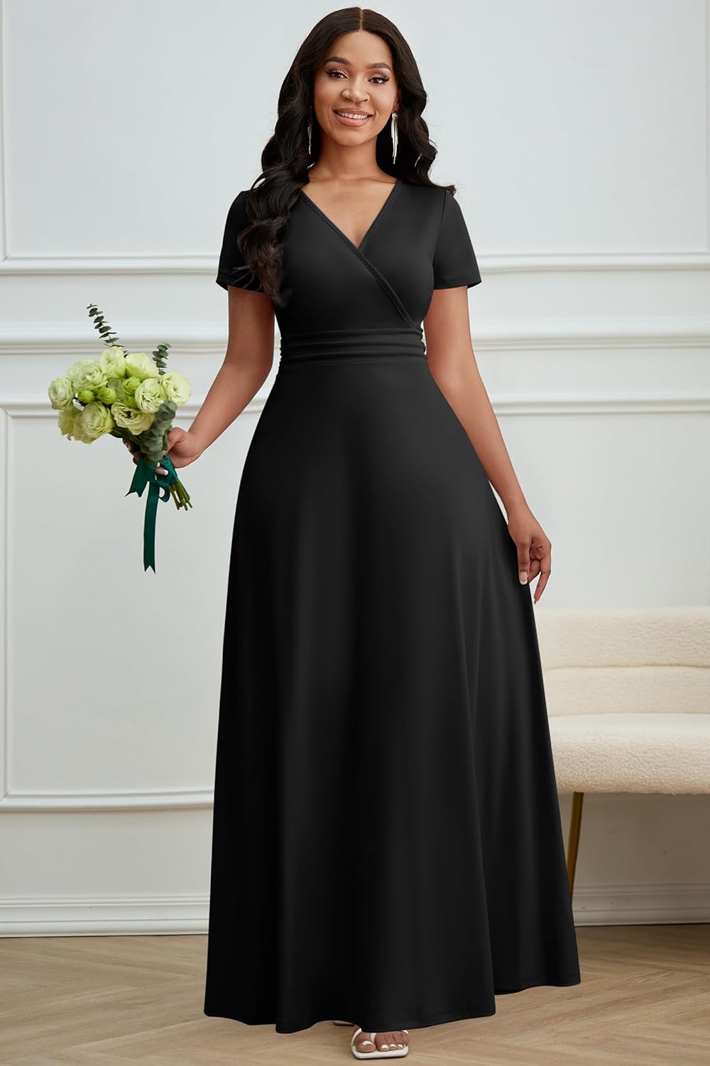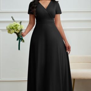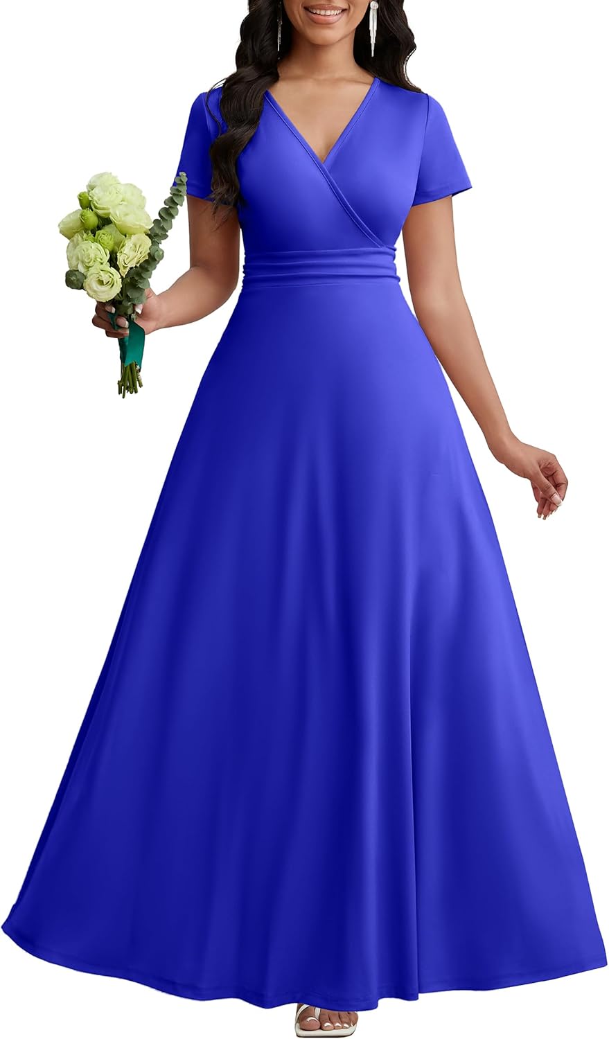 CLOCOR Maxi Dress for Women Long Formal Short Sleeve A Line V Neck Dresses Wedding Guest High Waist Elegant