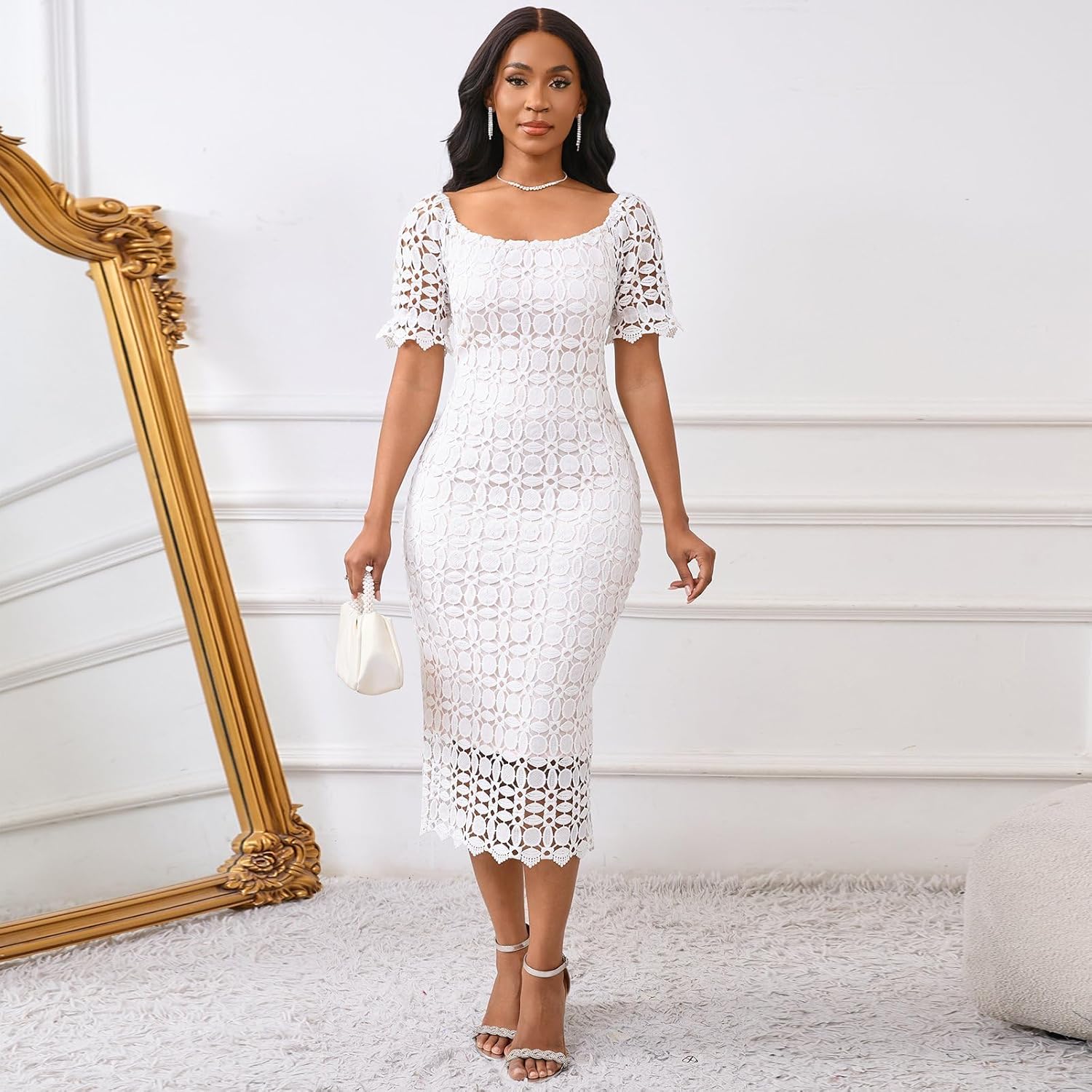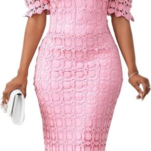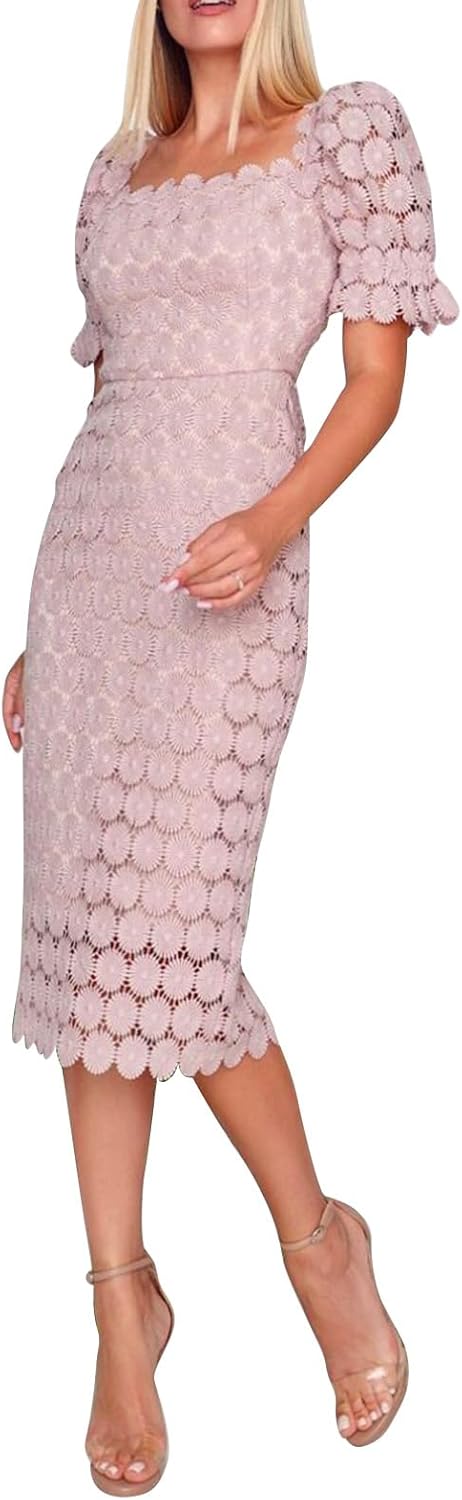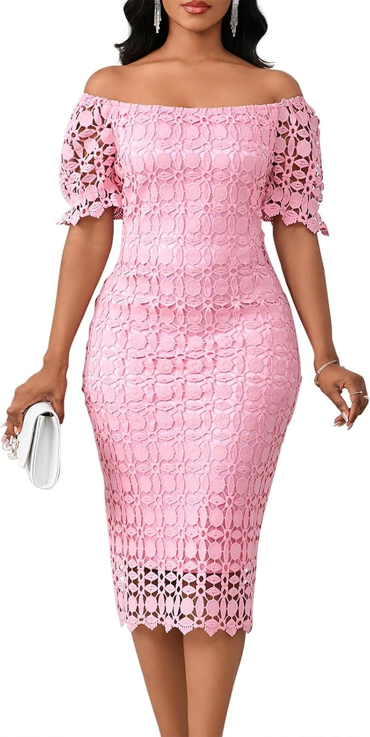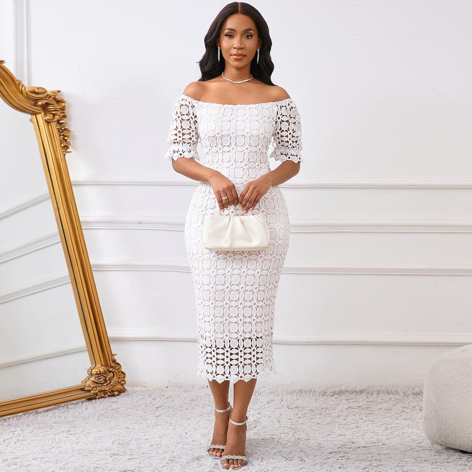Cololura Elegant Sexy Floral Lace Short Sleeve Off Shoulder Evening Gown Party Formal Bodycon Midi Dress