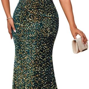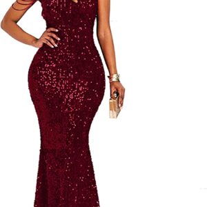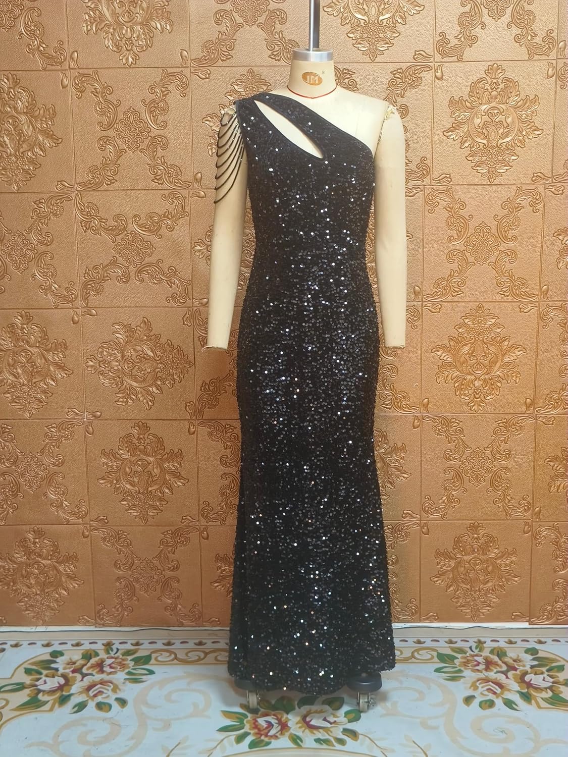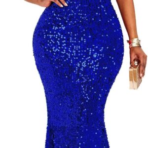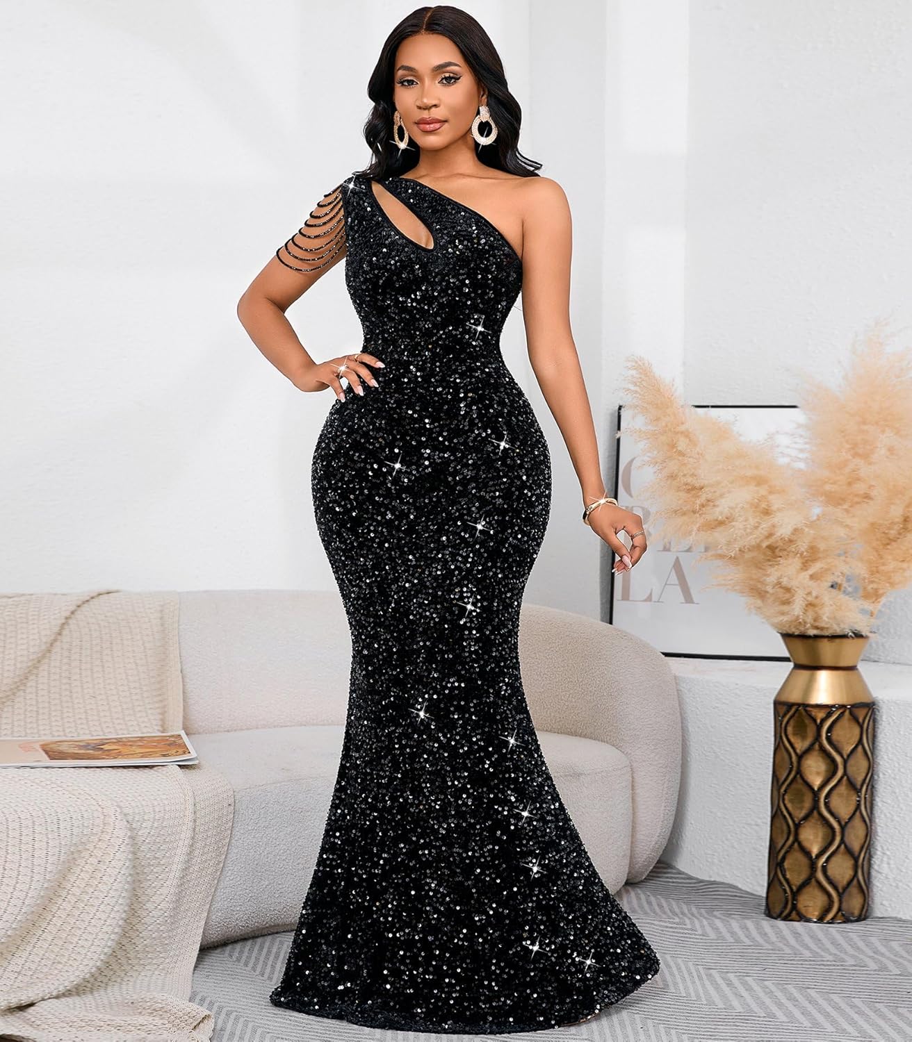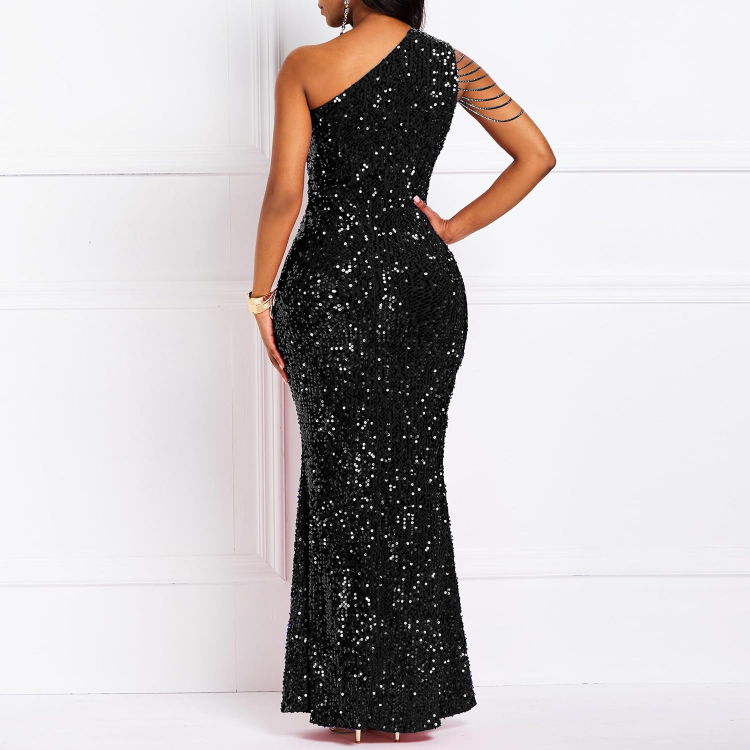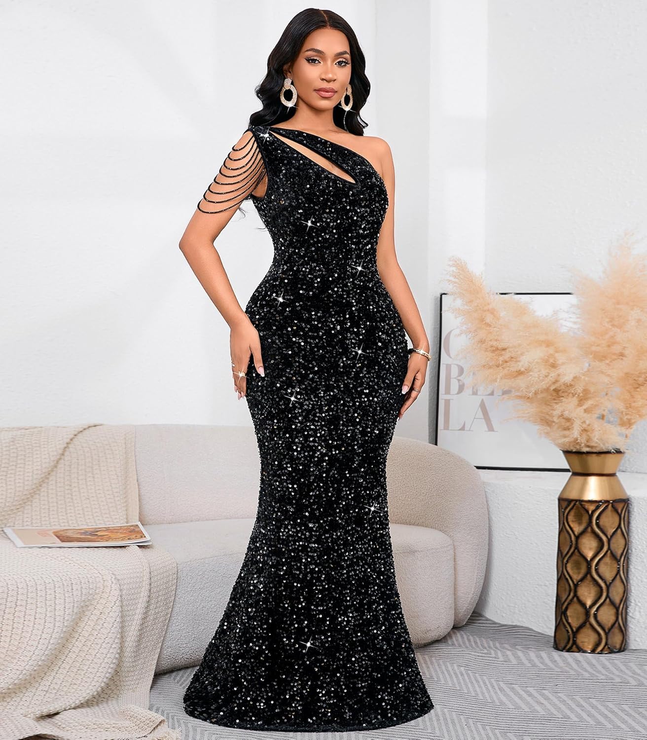 Cololura Women Sequin Elegant Sexy One Shoulder Tassel Mermaid Bodycon Cocktail Evening Dress