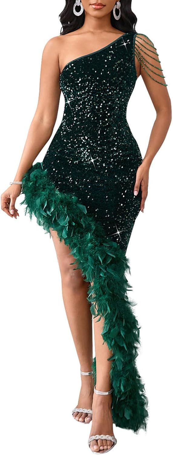 Cololura Women Sequin Elegant Sexy Tassels One Shoulder Mermaid Bodycon Cocktail Evening Midi Party Formal Dress