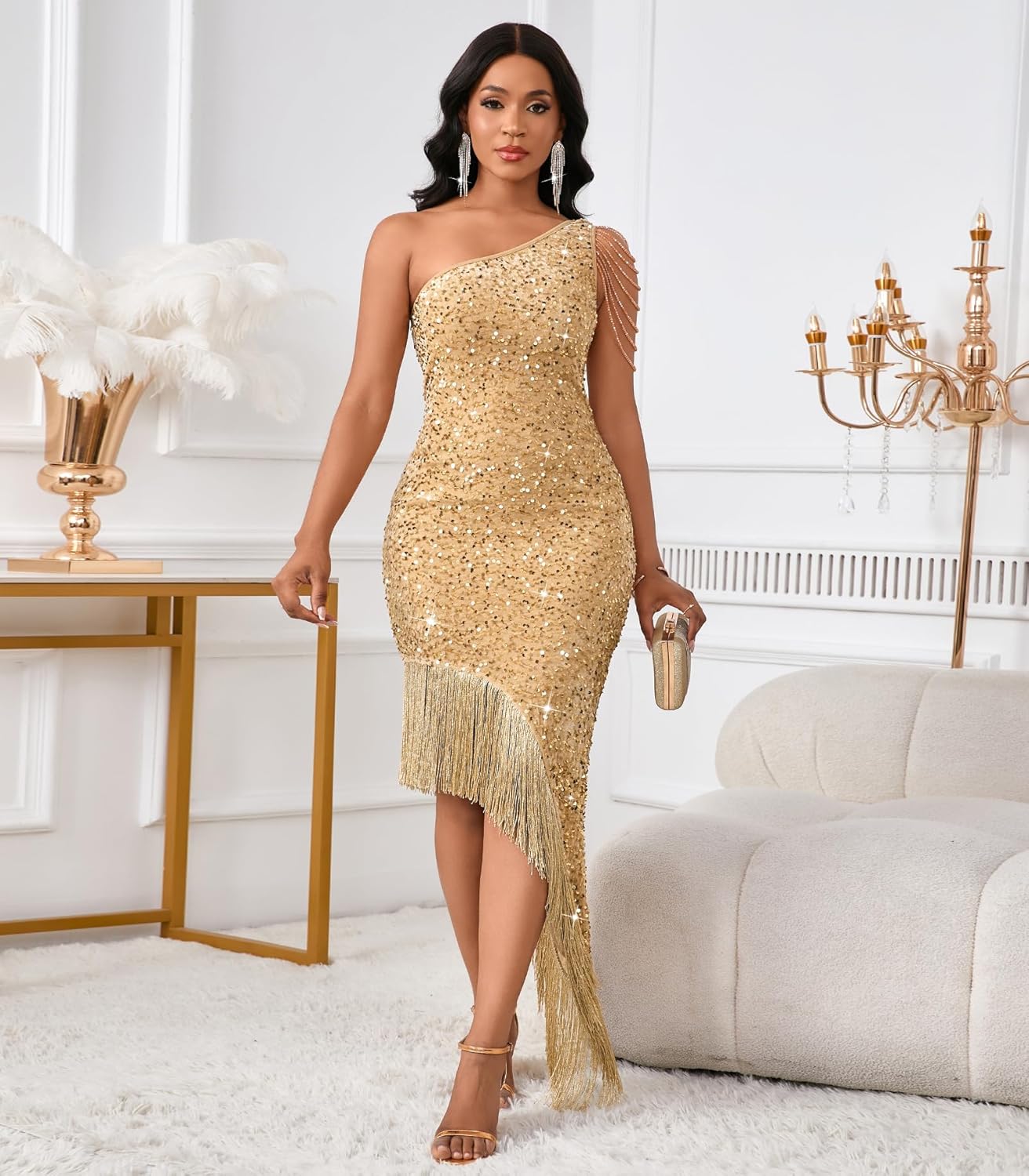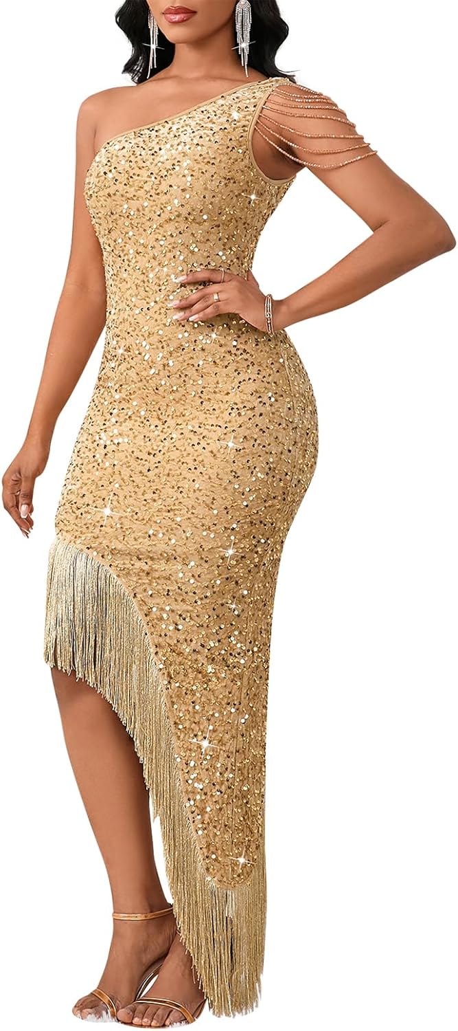Cololura Women Sequin Elegant Sexy Tassels One Shoulder Mermaid Bodycon Cocktail Evening Midi Party Formal Dress
