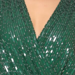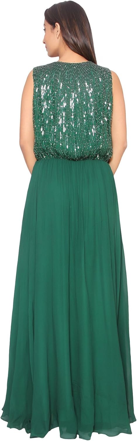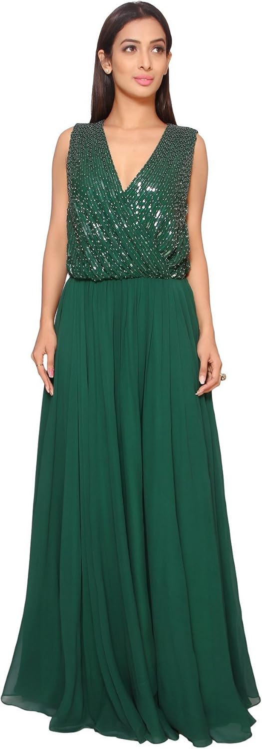 Emerald Green gown with overlap V-neck and HandEmbroidery in Georgette . Material: Georgette. Size: Small. Size:Small, Bust: 32-34, Waist: 26-28, Hip: 34-36