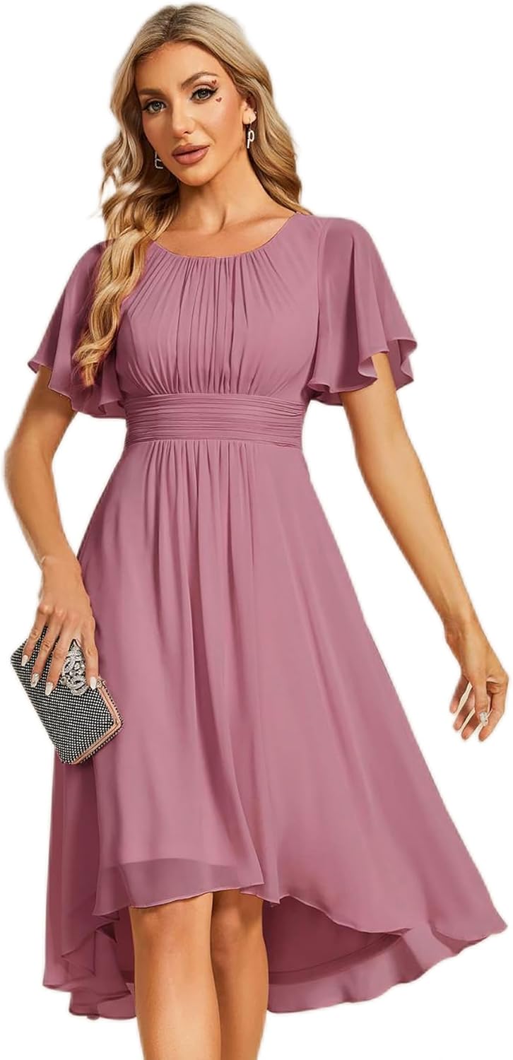 Ever-Pretty Women’s Chiffon Crew Neck Pleated Waist Short Sleeve Wedding Guest Dress 02053