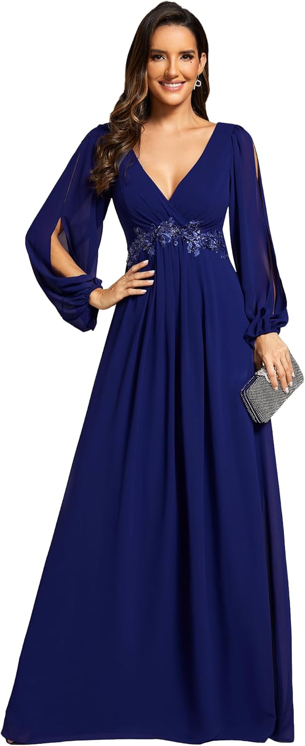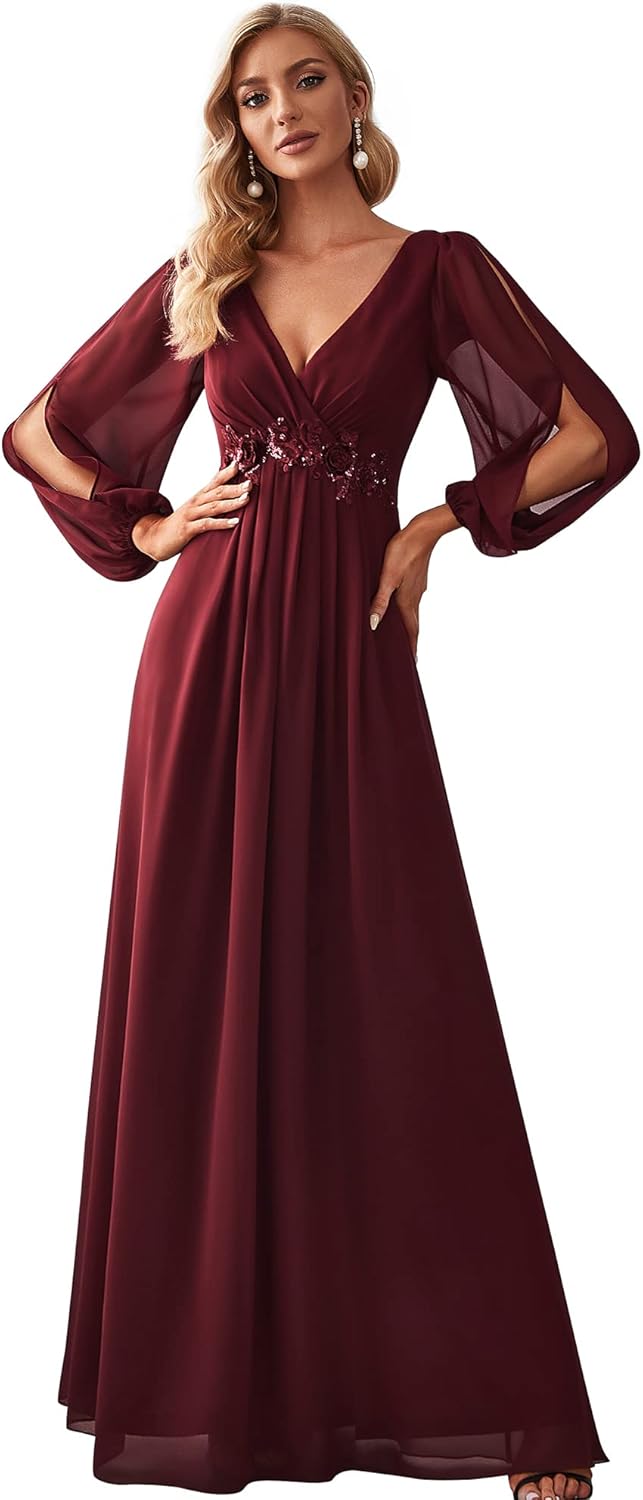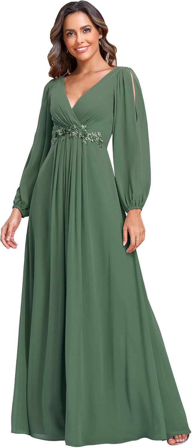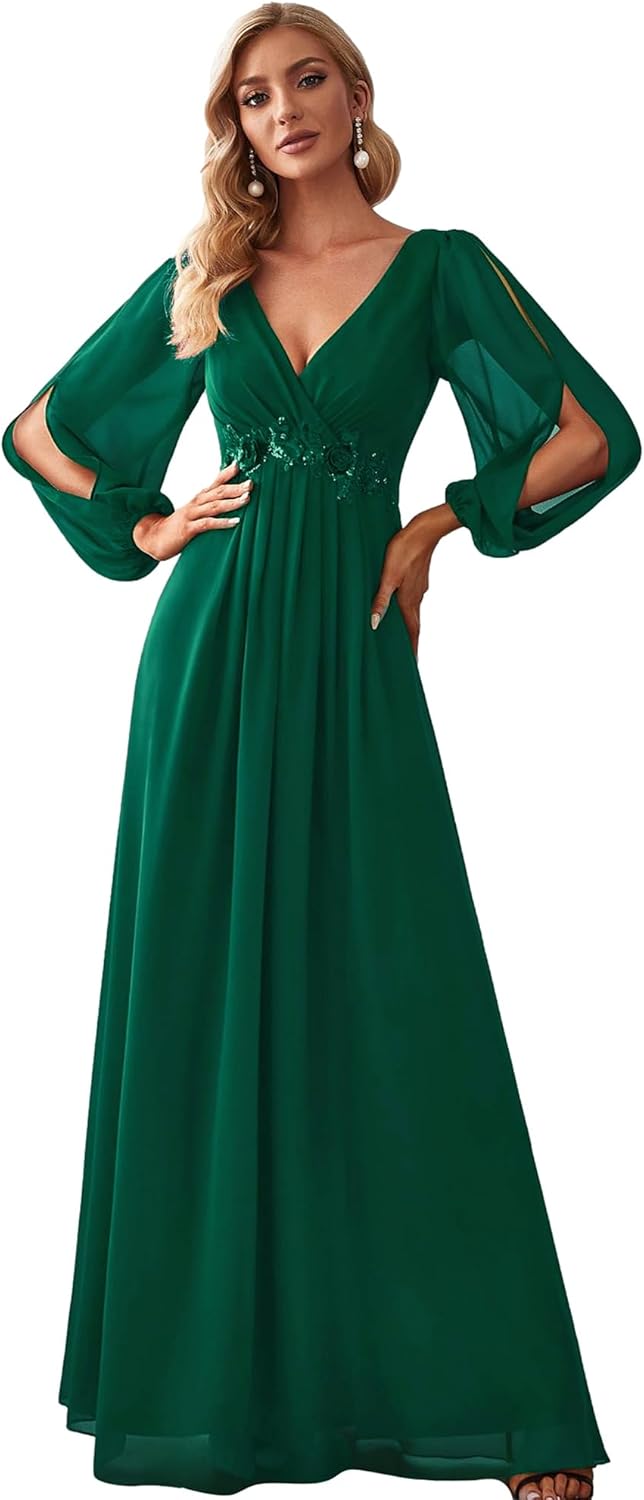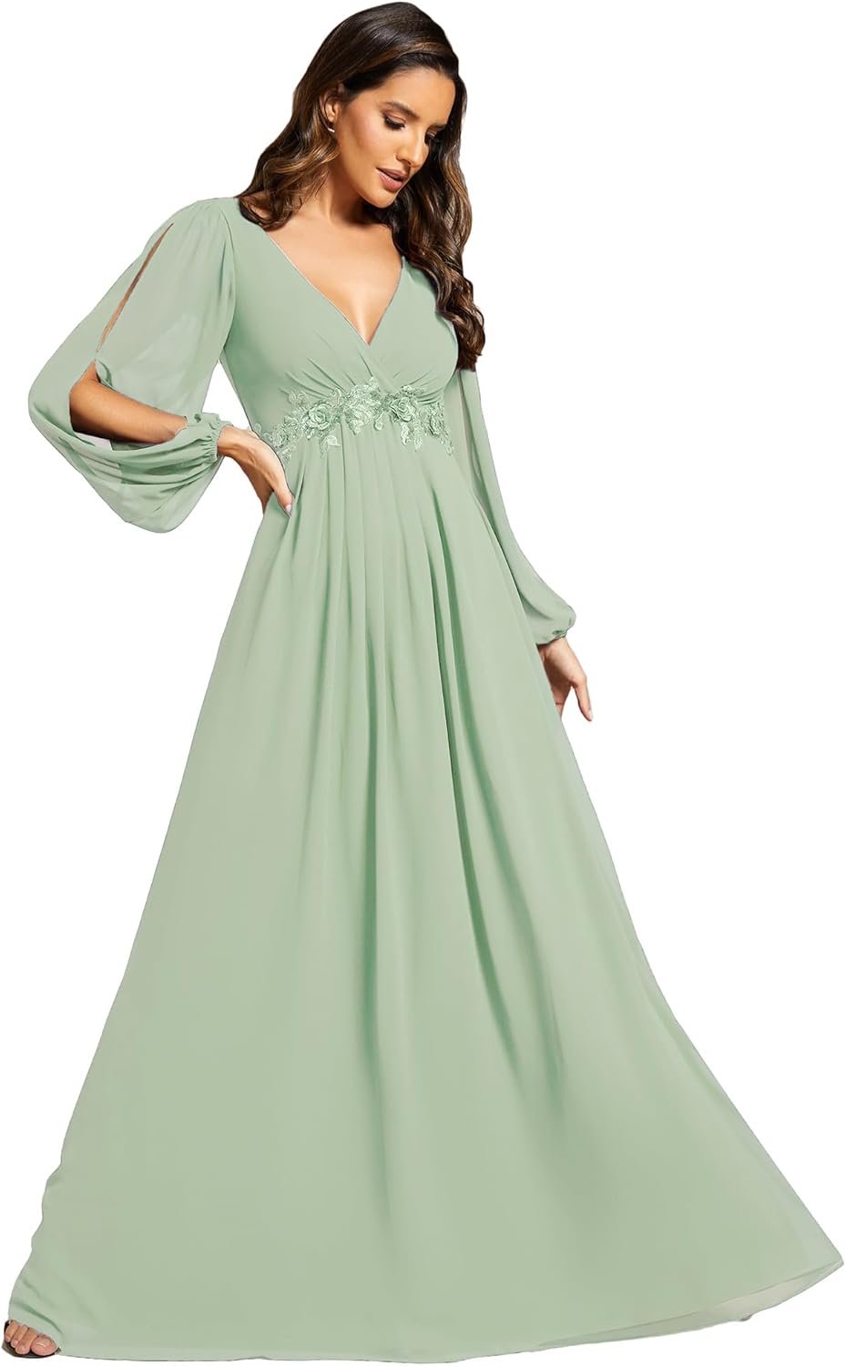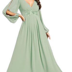 Ever-Pretty Women’s V Neck Long Lantern Sleeves Floor Length Ruched Chiffon A-Line Formal Evening Dress 00461