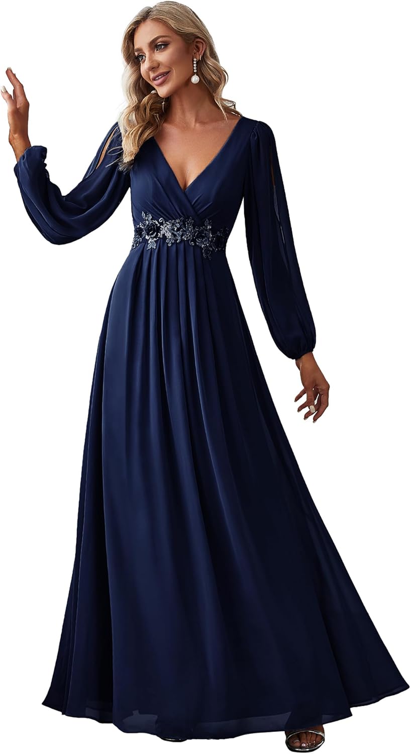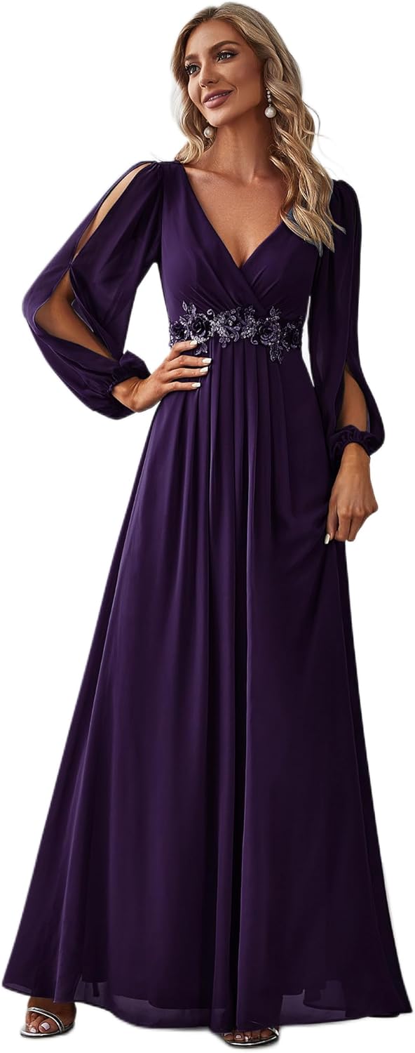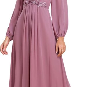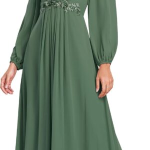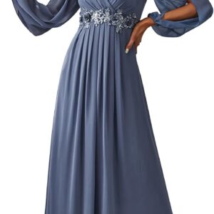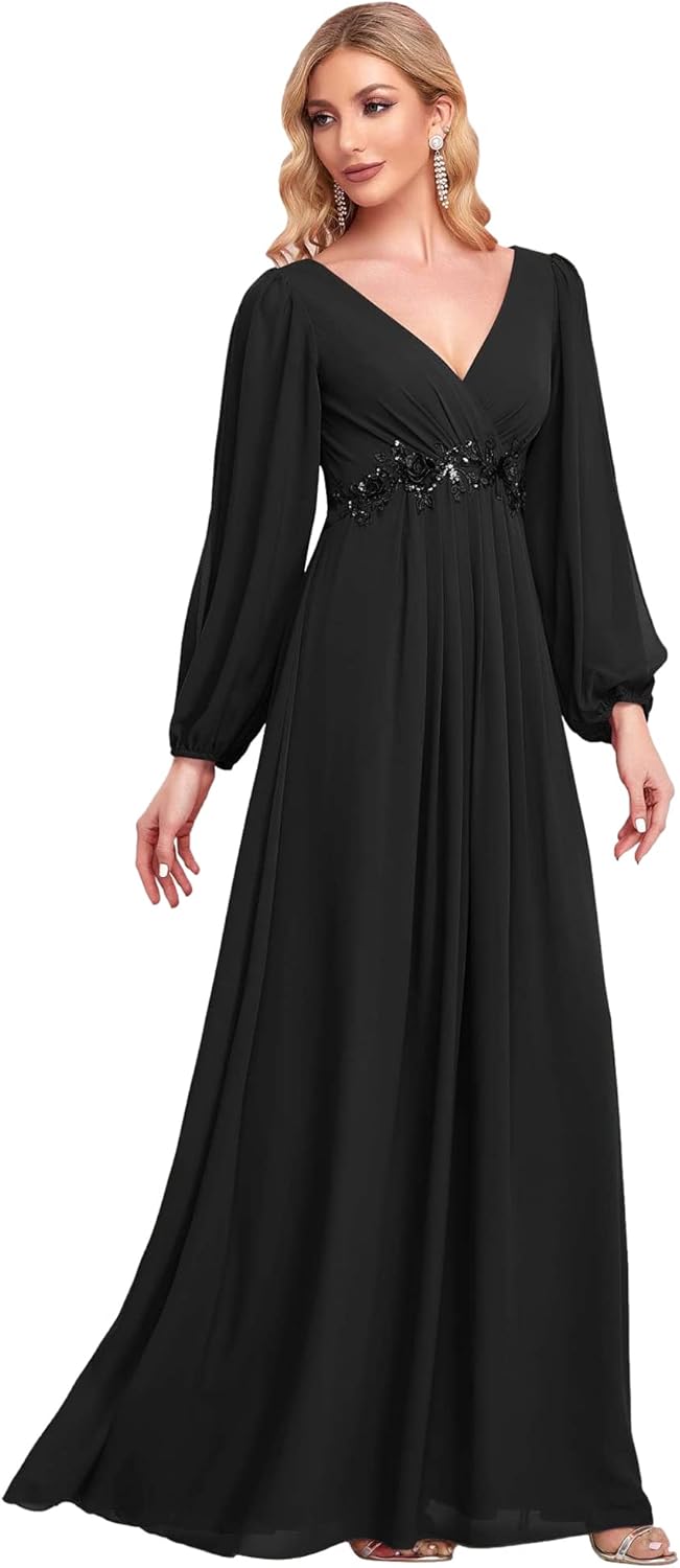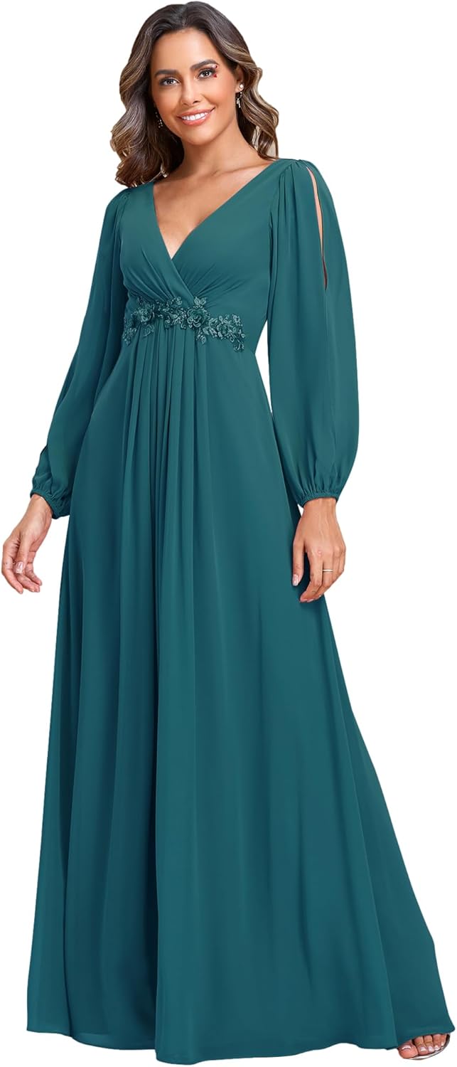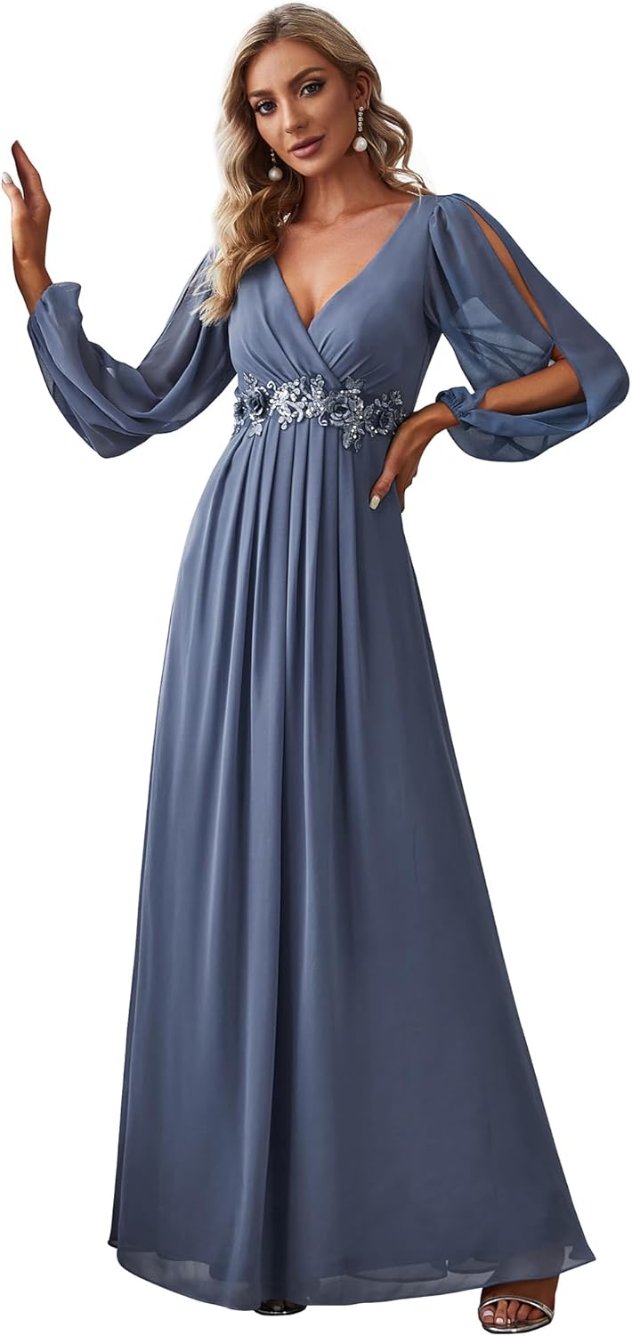 Ever-Pretty Women’s V Neck Long Lantern Sleeves Floor Length Ruched Chiffon A-Line Formal Evening Dress 00461