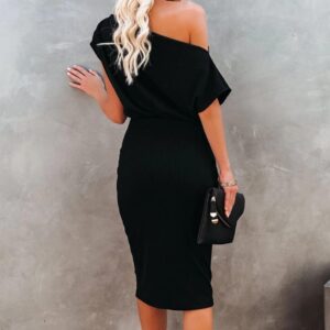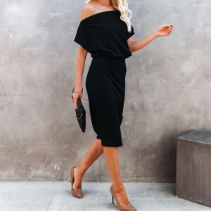 - Features: One Off Shoulder Style Detail, Short Sleeve, Slash Neck, Slim Fit, Solid Color, Knee Length