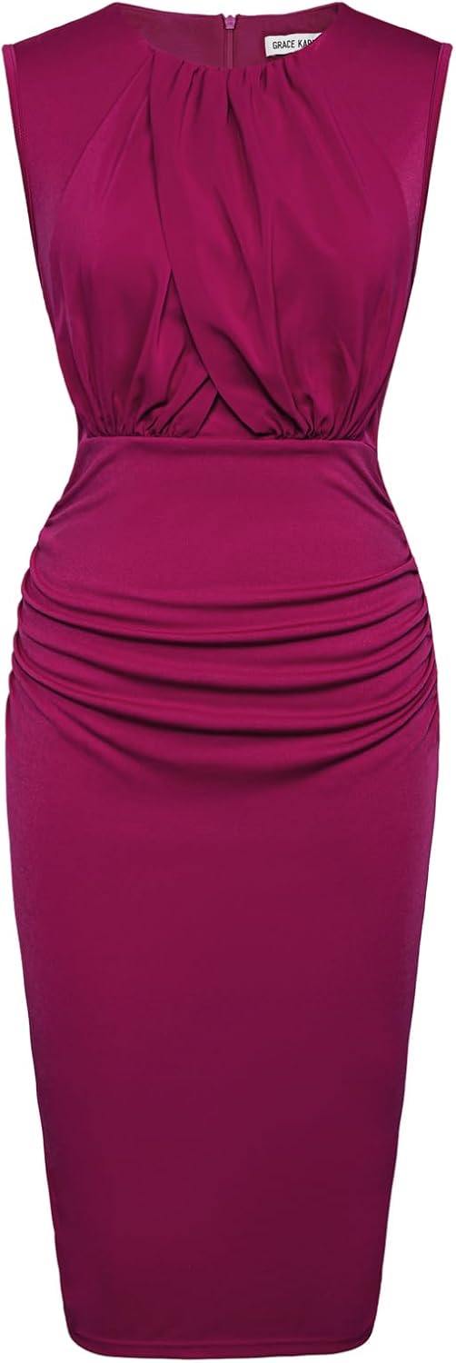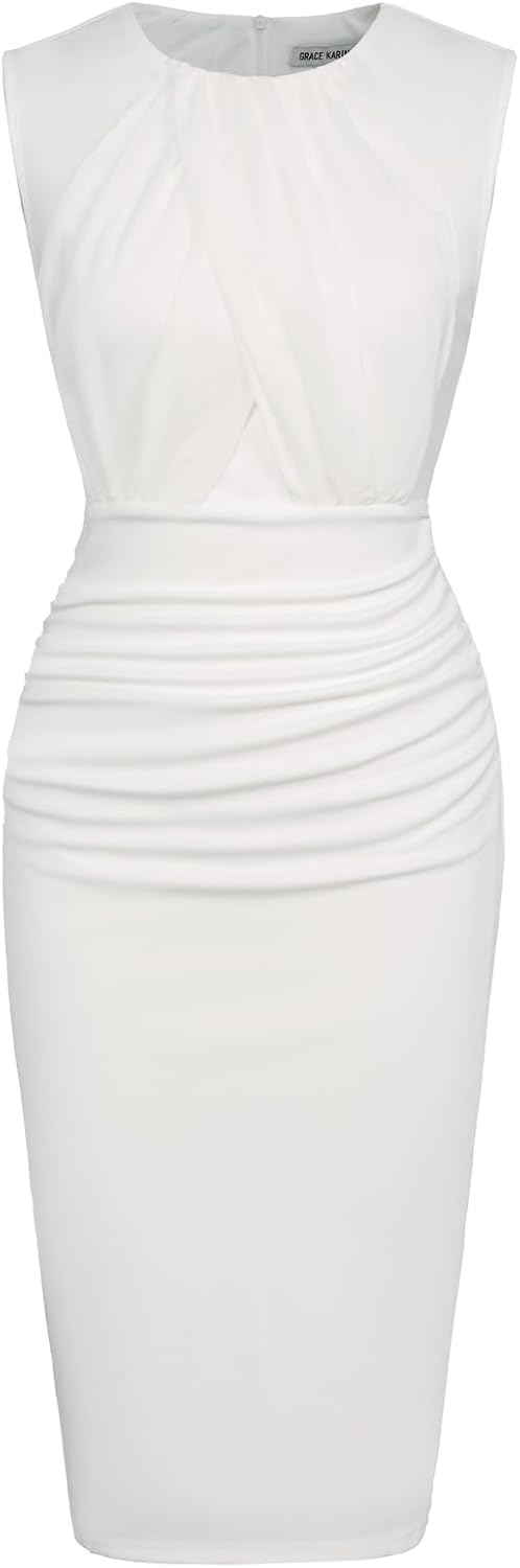 GRACE KARIN Women’s Ruched Bodycon Dress Summer Sleeveless Front Drape Patchwork Crew Neck Midi Cocktail Dress