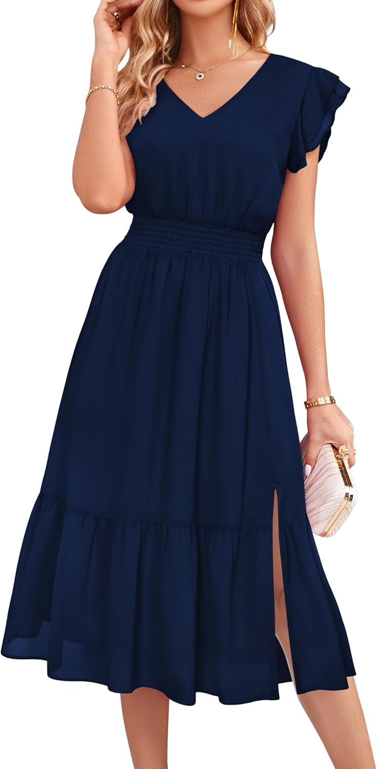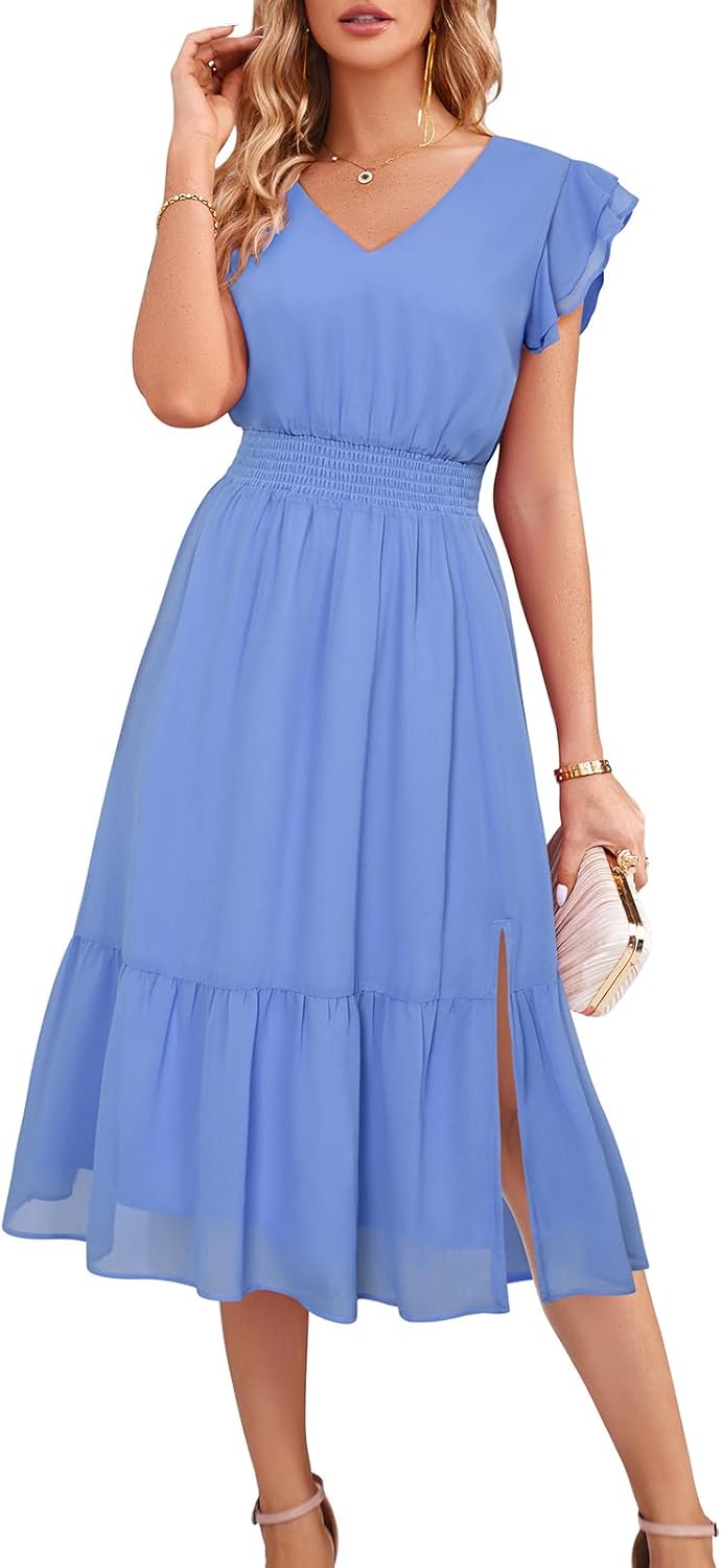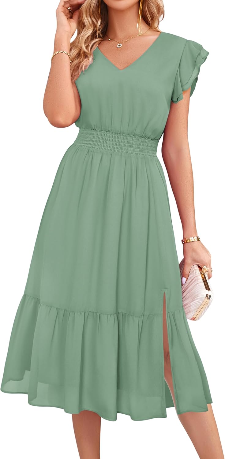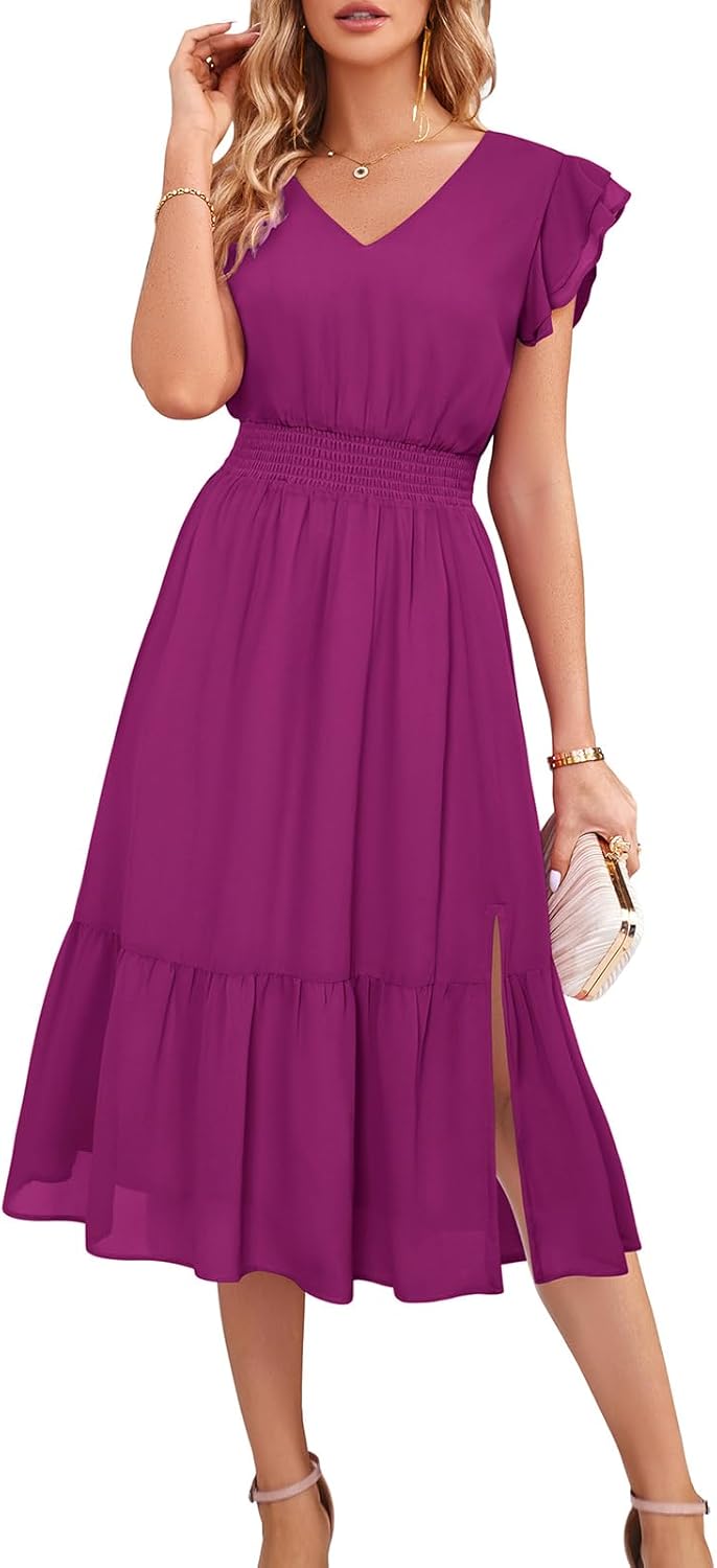 GRACE KARIN Women’s V Neck Ruffle Sleeve Summer Dress 2025 Split Flowy Tiered Midi Dress Wedding Guest Cocktail Dresses