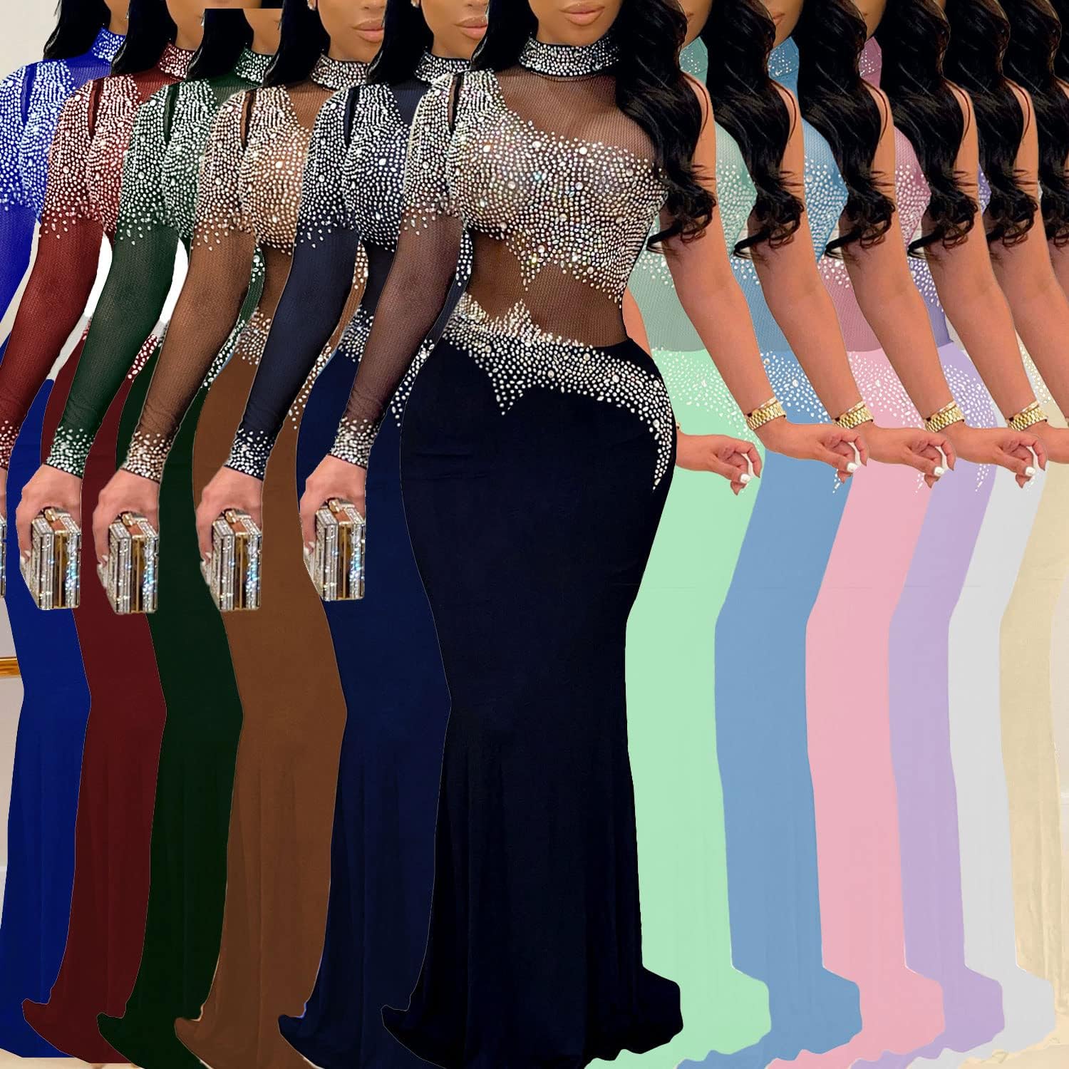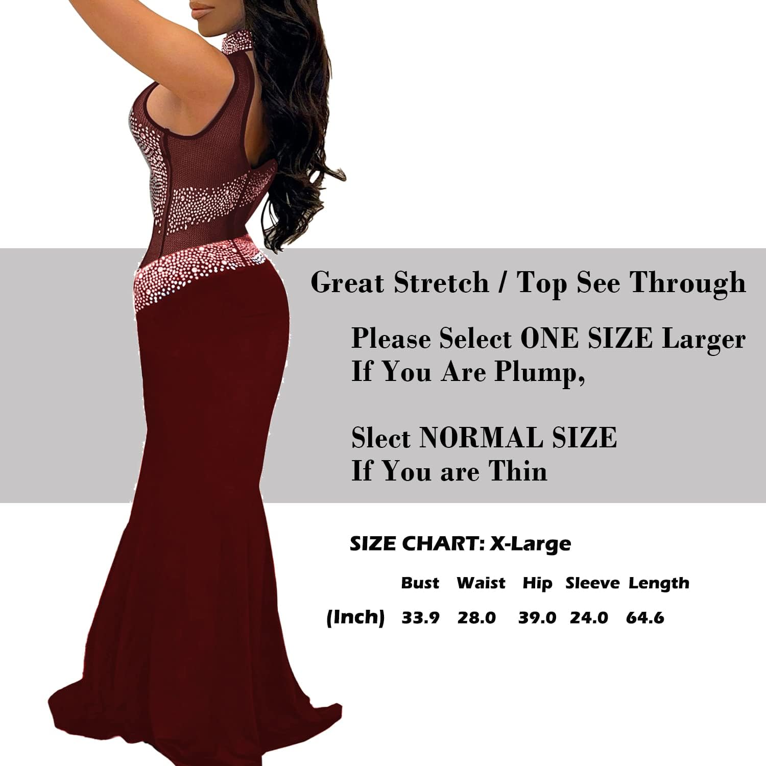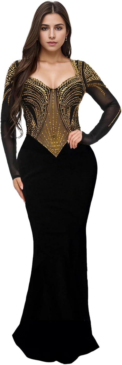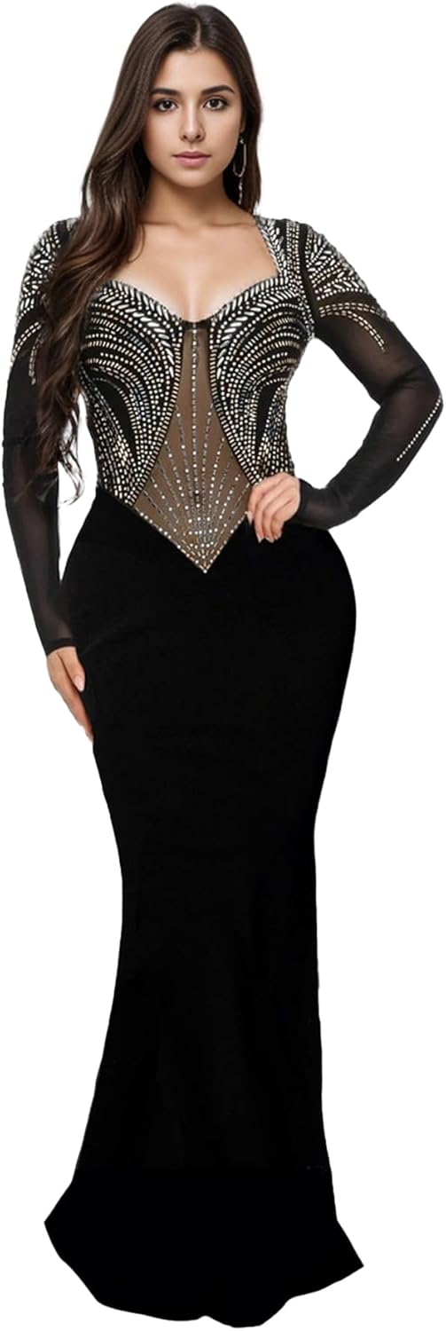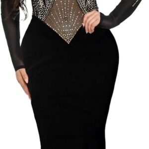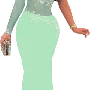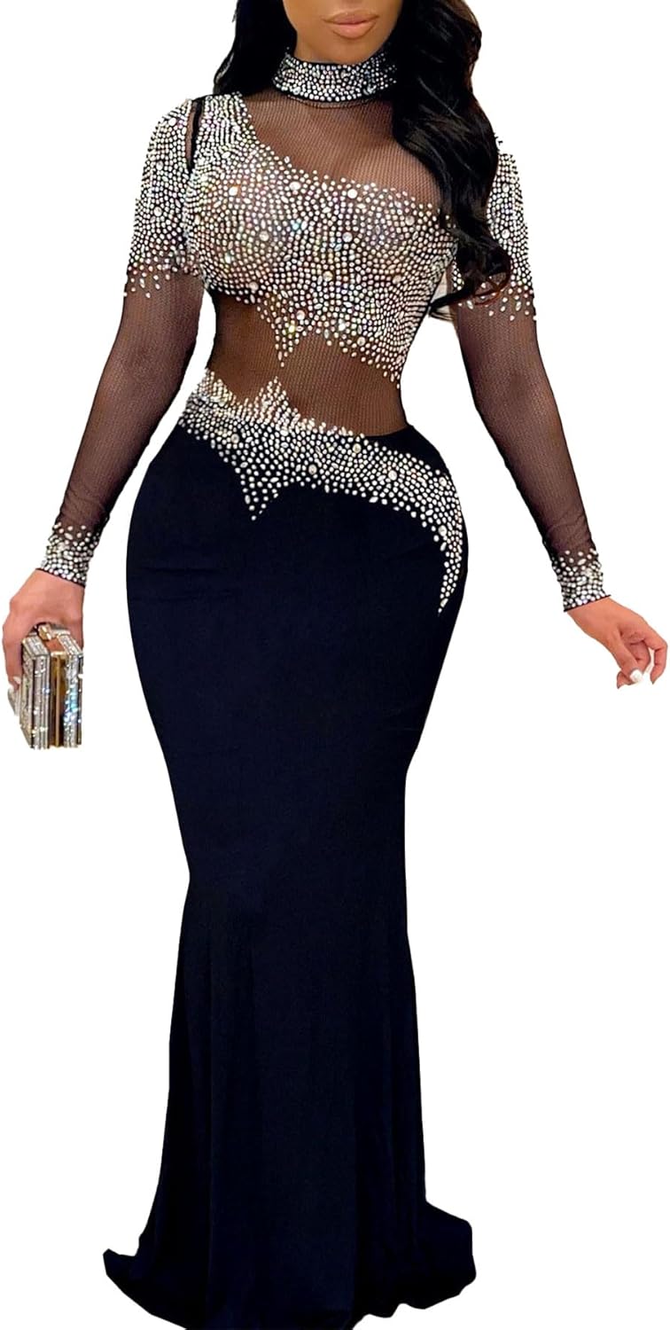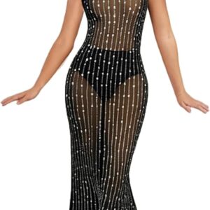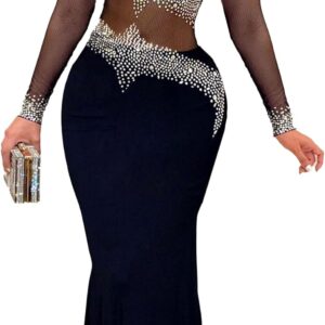 PORRCEY Women Sexy Rhinestone Long Sleeve Mesh See Through Party Club Night F…