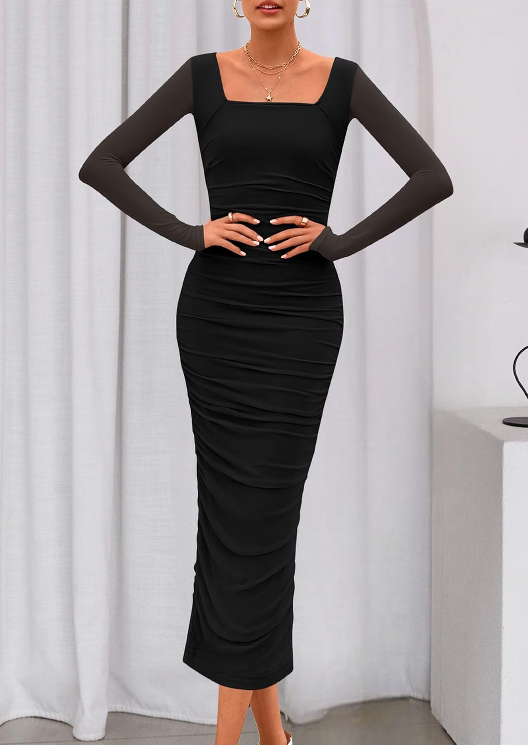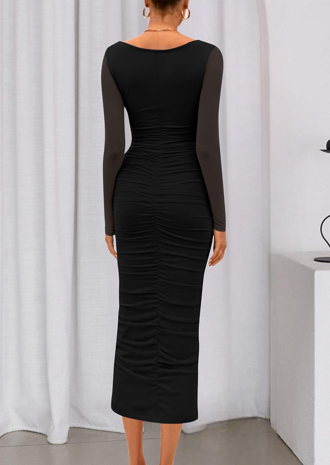 PRETTYGARDEN Fall Wedding Guest Dresses for Women 2025 Ruched Bodycon Midi Long Sleeve Formal Cocktail Dress
