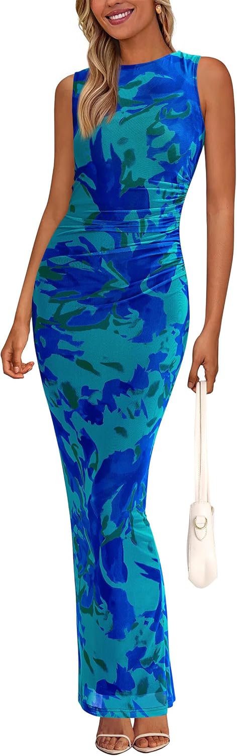 PRETTYGARDEN Wedding Guest Dresses for Women 2025 Summer Spring Floral Bodycon Sleeveless Mesh Maxi Long Dress