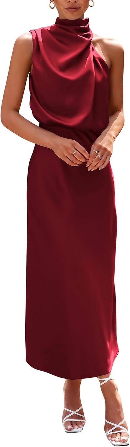 PRETTYGARDEN Women’s 2025 Summer Satin Dress Elegant Sleeveless Mock Neck Cocktail Party Maxi Dresses