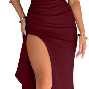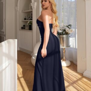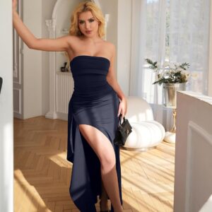 Features: Strapless evening gown formal dress, belly ruched design, can perfectly cover the stomach fat, side high slit ruffle design, can show slender legs, ruffle design is more elegant and charming, the fabric has big elastic, suitable for various body types.