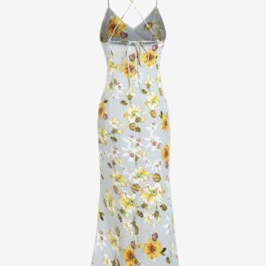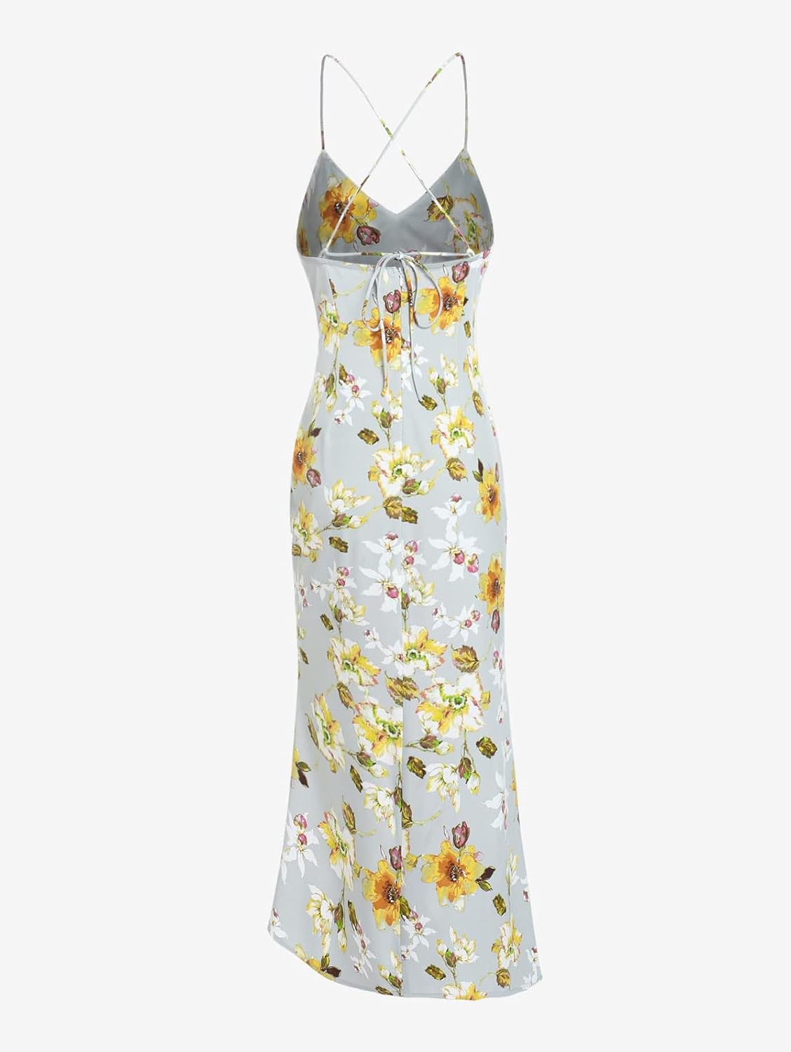 ZAFUL Womens Summer Floral Spaghetti Midi Dresses 2025 Sexy V Neck Sleeveless Drawstring Ruched Split Backless Cocktail Dress